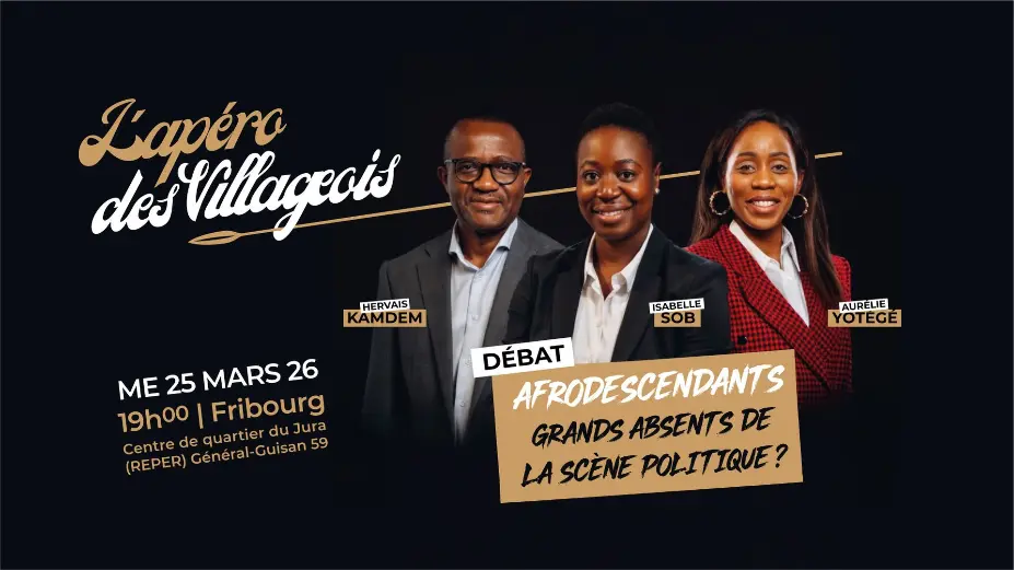 Participez à notre 2e Apéro des Villageois 2026 qui consistera en un débat avec 3 afrodescendant·e·s fribourgeois·e·s récemment élu·e·s à Fribourg et à Villars-sur-Glâne autour de la question «Afrodescendants: grand absents de la scène politique?»: